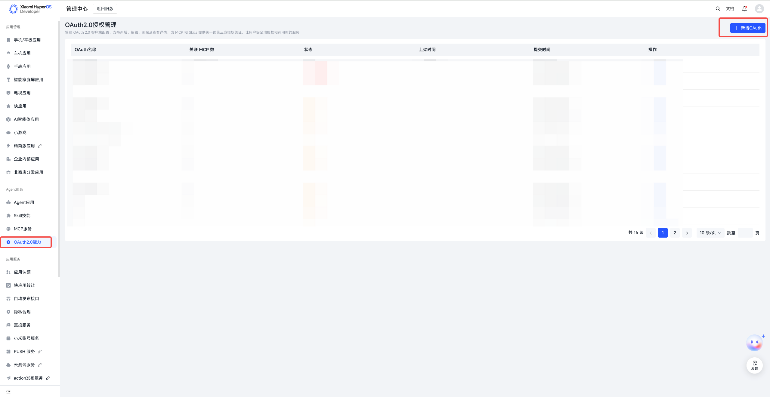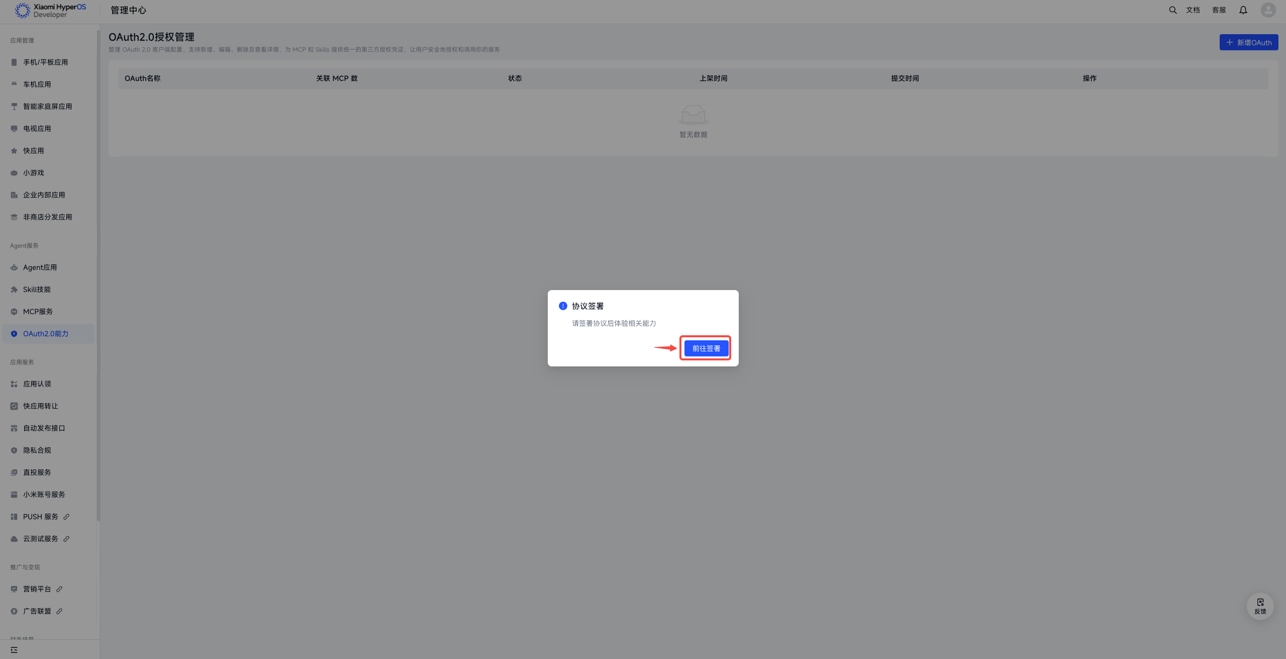 ①登录并前往小米澎湃OS开发者平台-管理中心,点击“新增OAuth”按钮,即可开始OAuth首次创建。