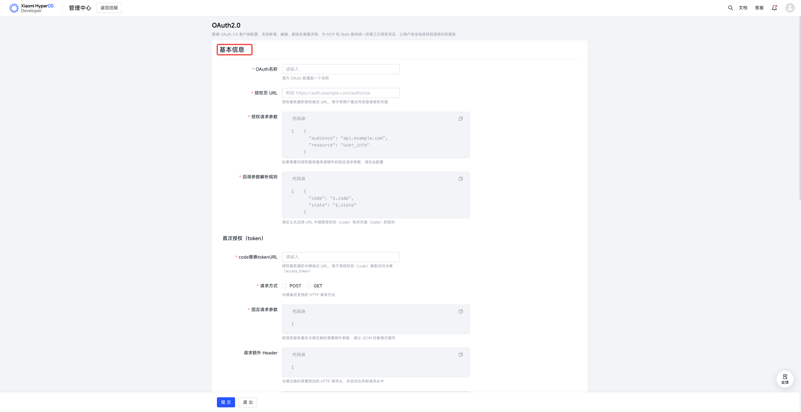 | 固定请求参数 | 若授权服务器在令牌交换时需要额外参数,请以 JSON 对象格式填写 | - 格式:合法的 JSON 对象 - 长度:不超过 4000 字符 |