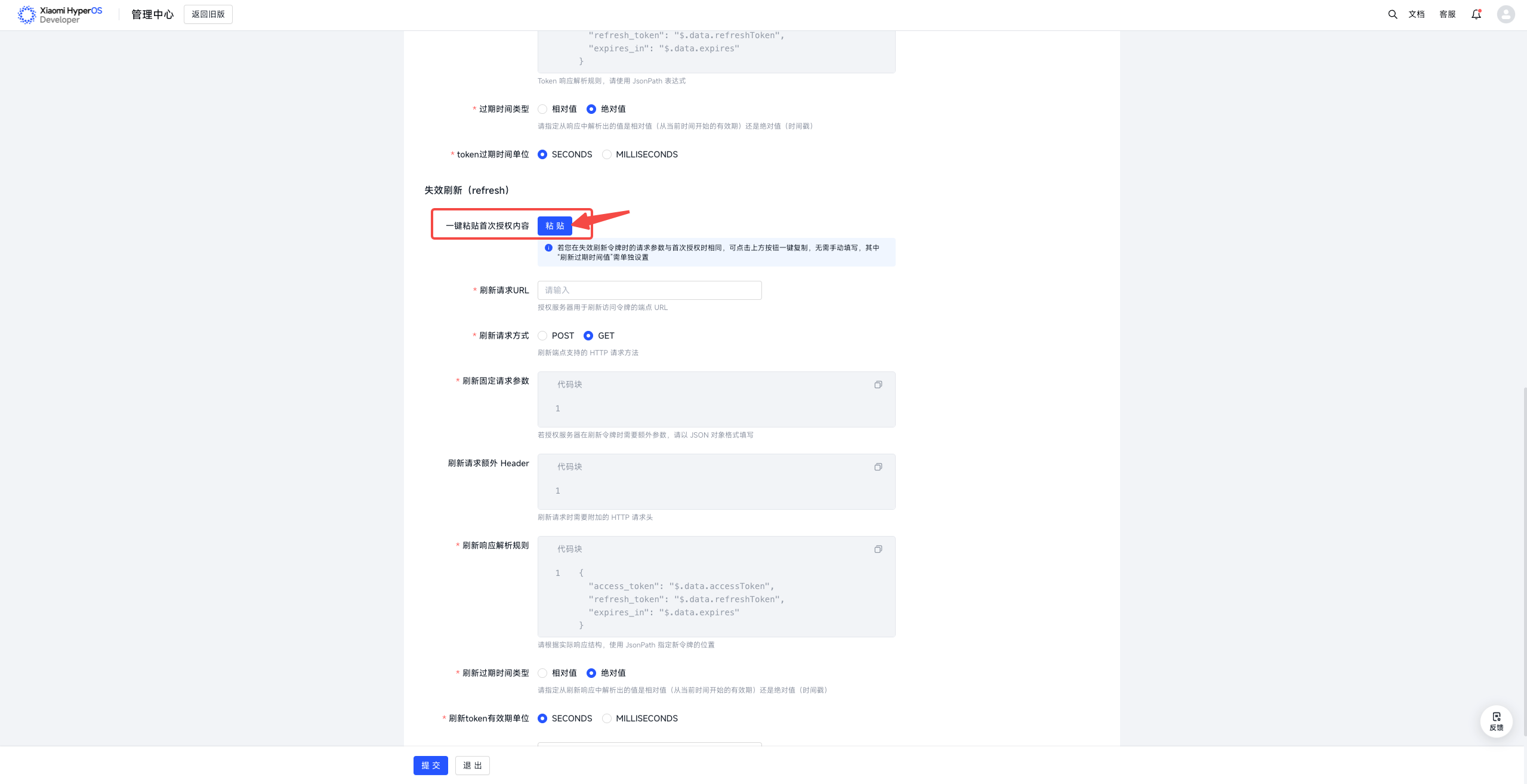 | 刷新过期时间值 | 根据授权服务器的实际要求,配合刷新token有效期单位 | refresh_token固定过期时长,配合unit使用,0=不过期 |