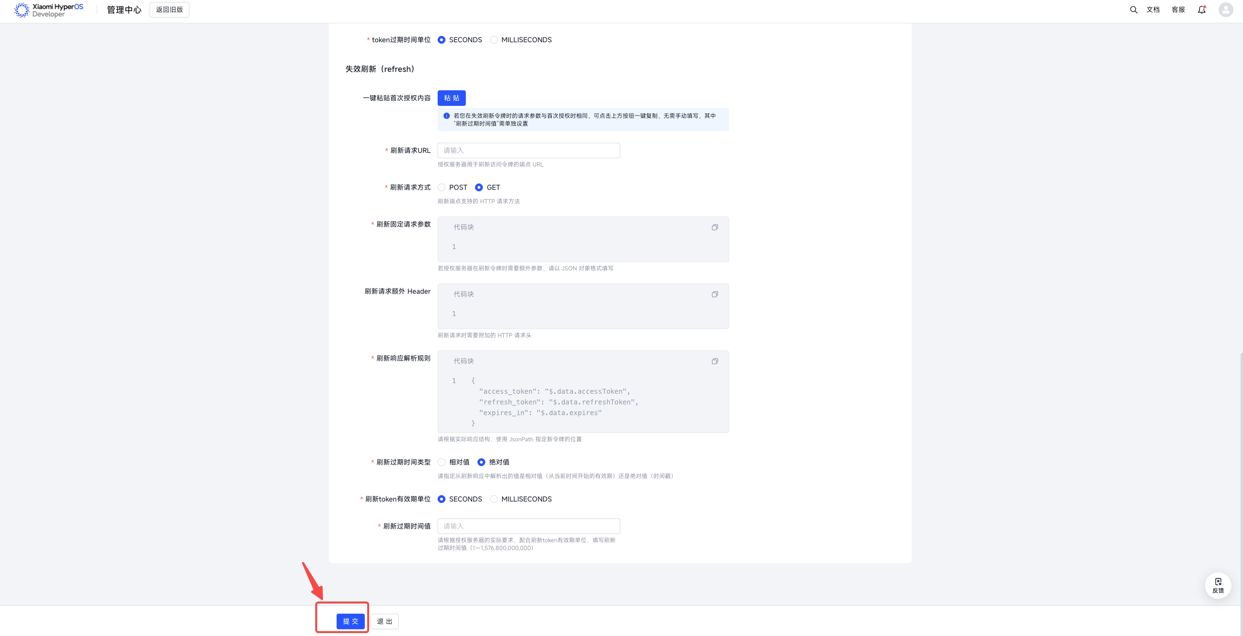 | 刷新token有效期单位 | token过期的时间单位 | 单选,选项为SECONDS、MILLISECONDS |