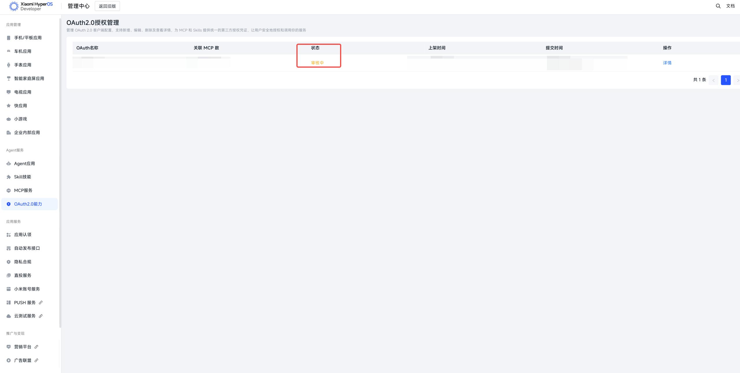 当所有信息都填写完成后,您可点击“提交审核”按钮,此版本OAuth即会进入审核流程。提交审核后返回列表页,可在列表状态字段中查看审核状态