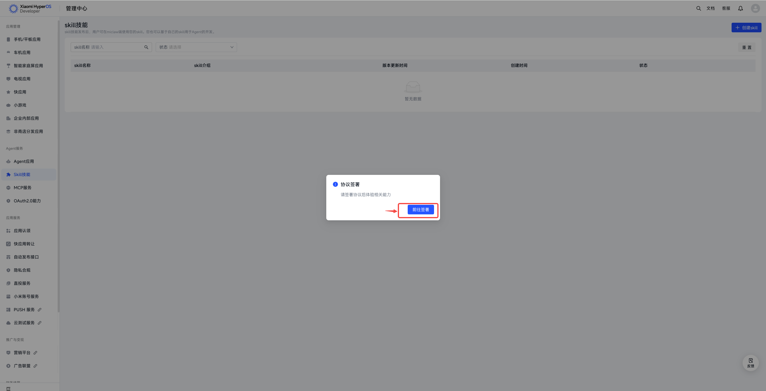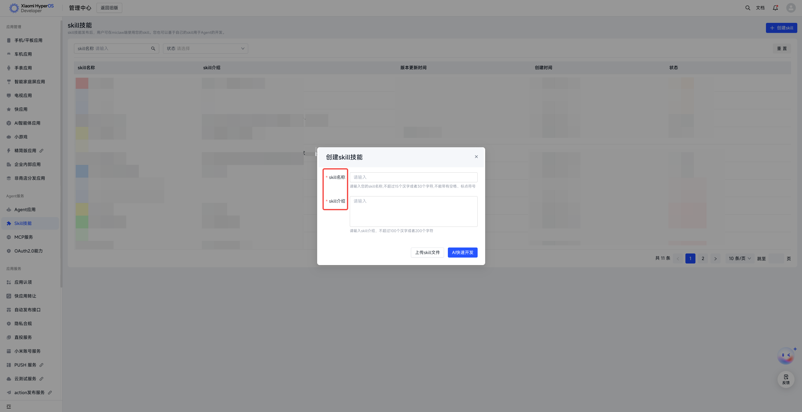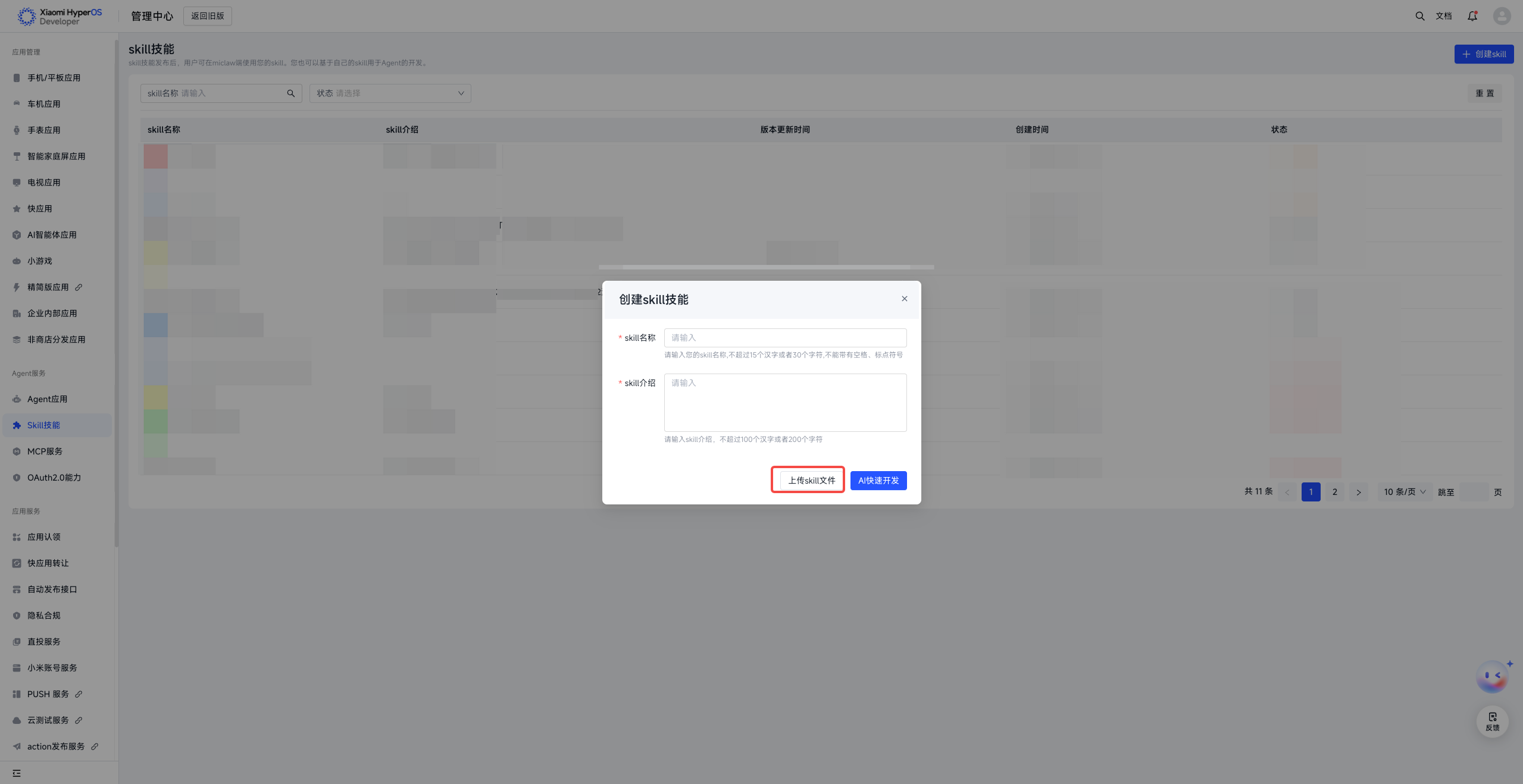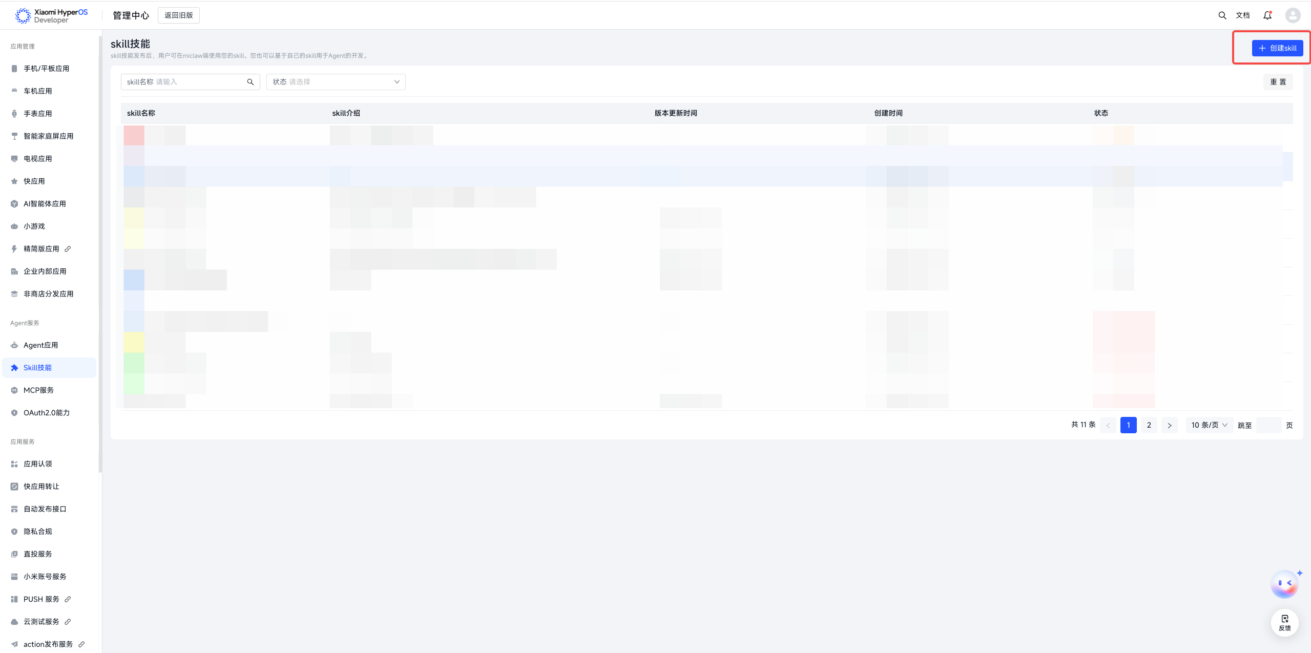 ①登录并前往小米澎湃OS开发者平台-管理中心,点击“创建Skill”按钮,即可开始应用首次创建。