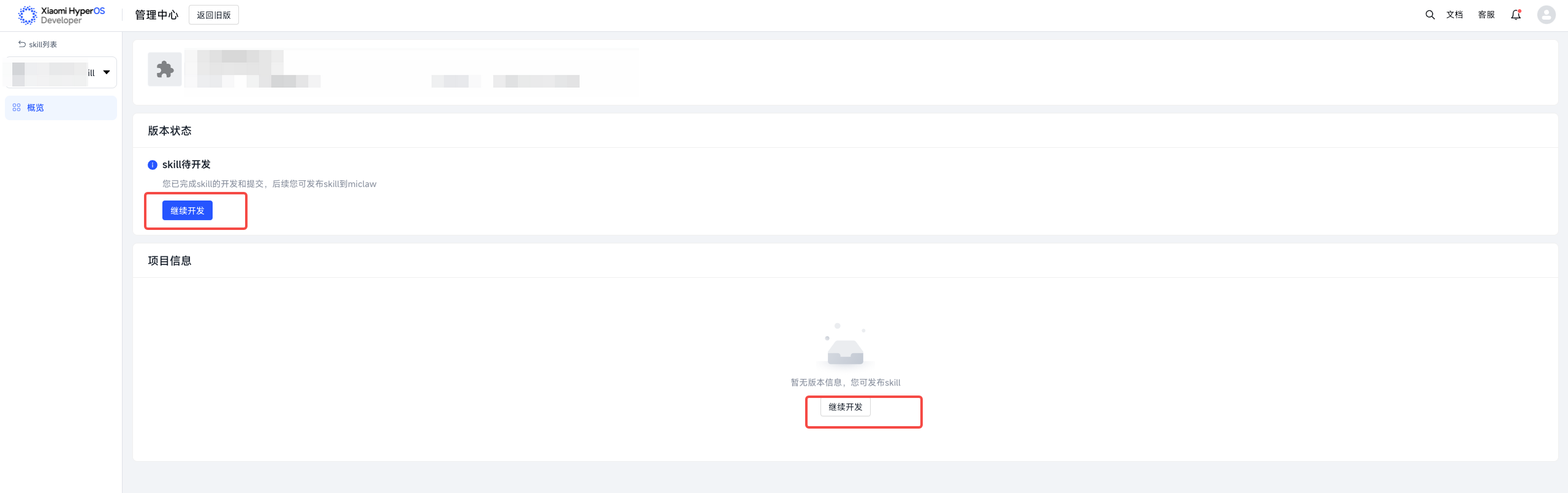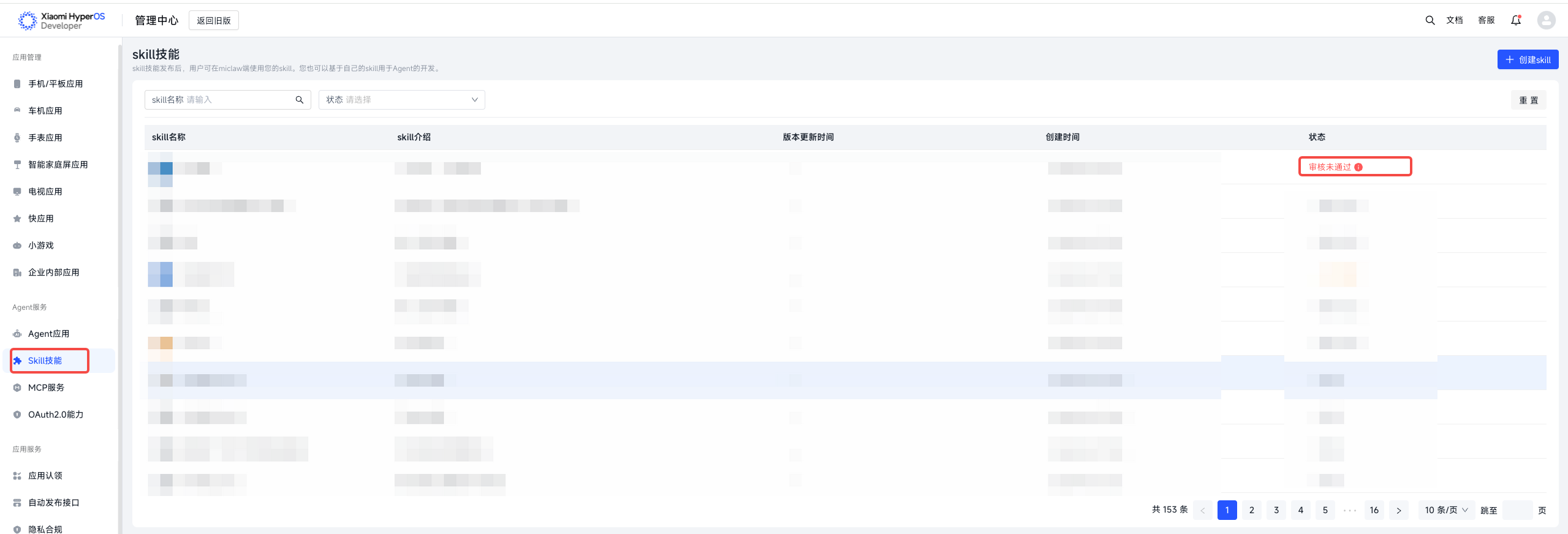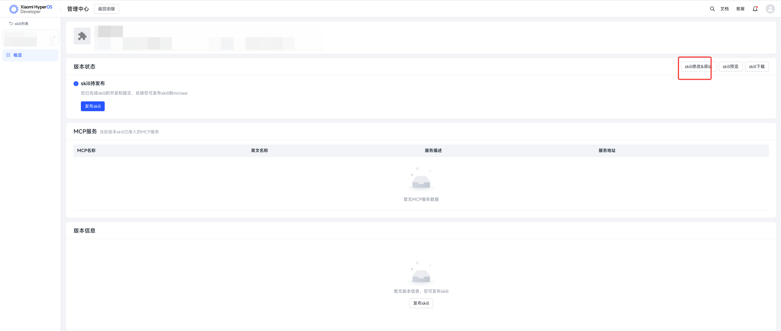 ①登录并前往小米澎湃OS开发者平台-管理中心,点击“创建Skill”按钮,即可开始应用首次创建。