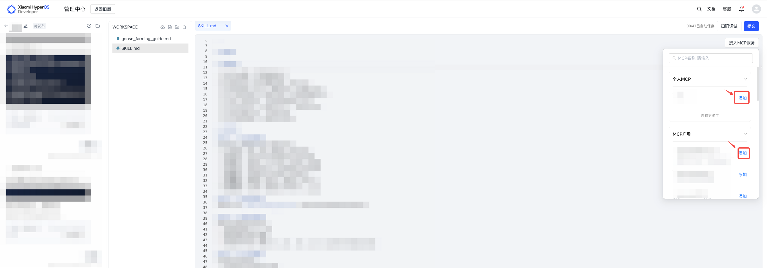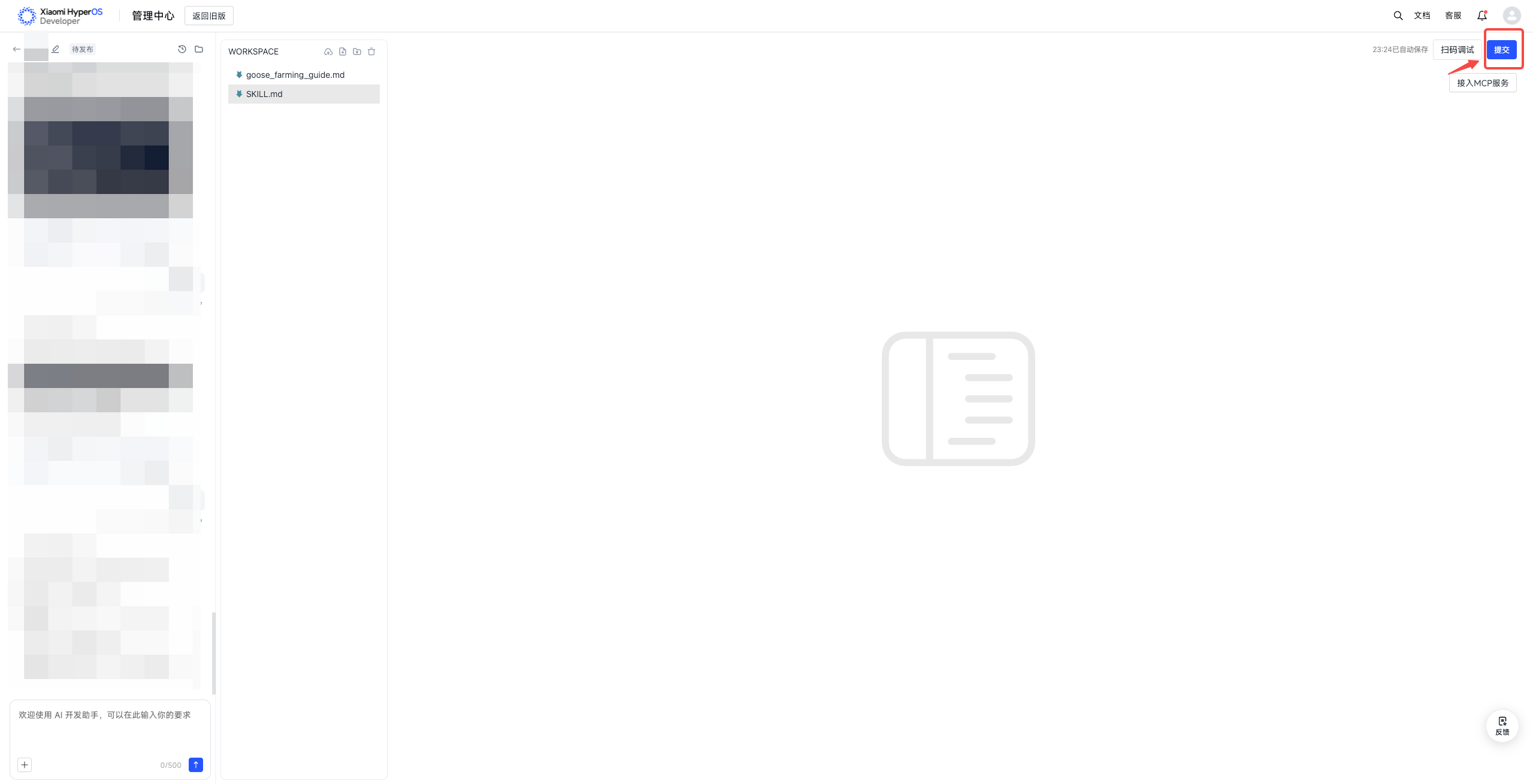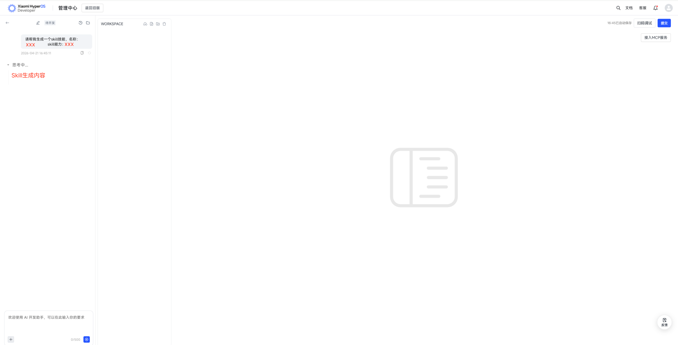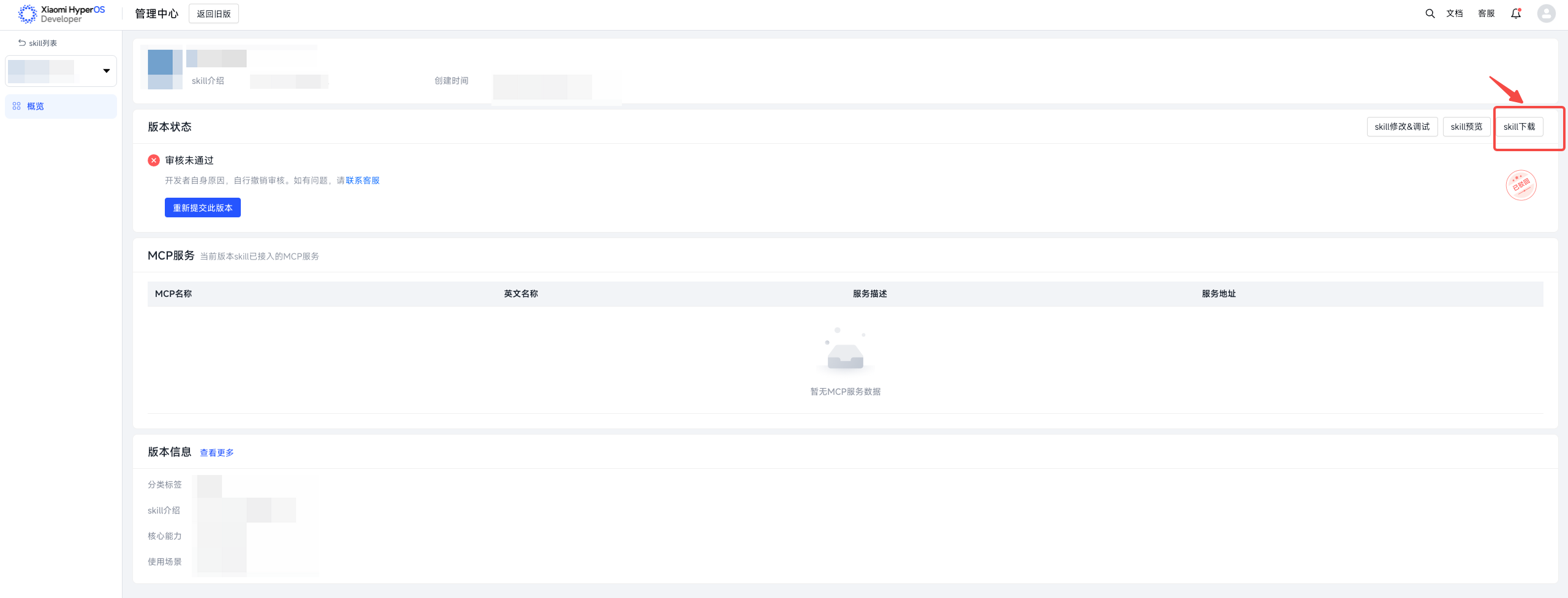 ①登录并前往小米澎湃OS开发者平台-管理中心,点击“创建Skill”按钮,即可开始应用首次创建。