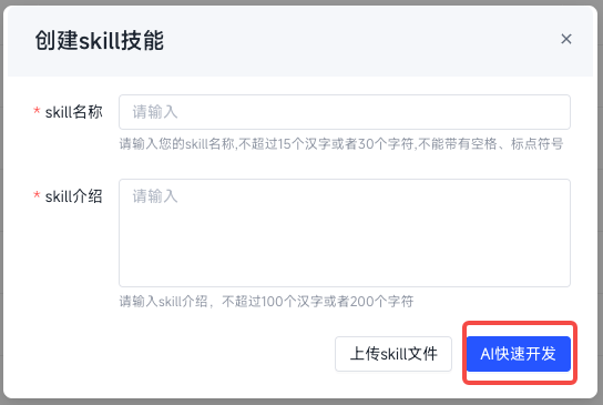 创建 Skill前,您需要准备好Skill名称和Skill介绍,以下是具体步骤: