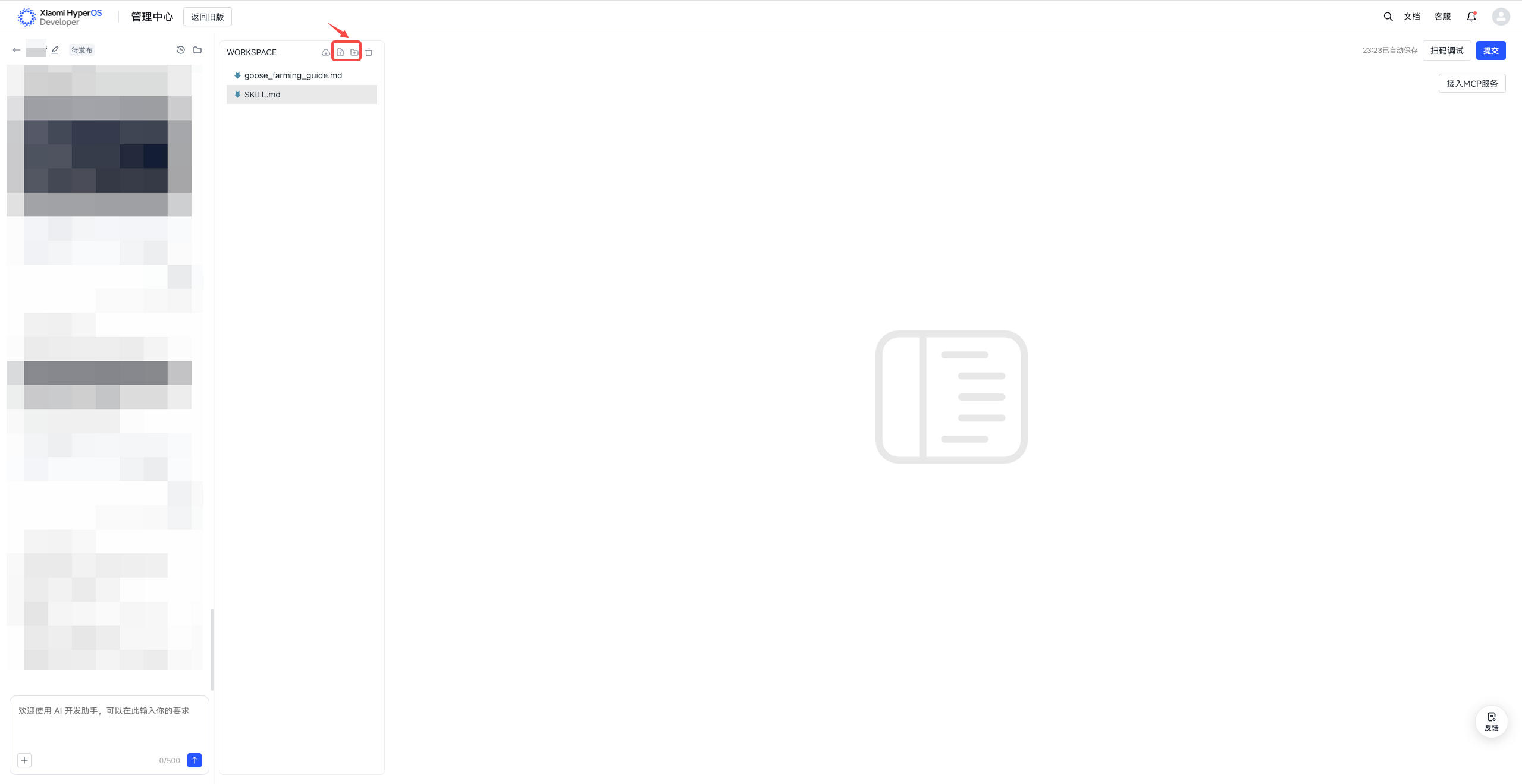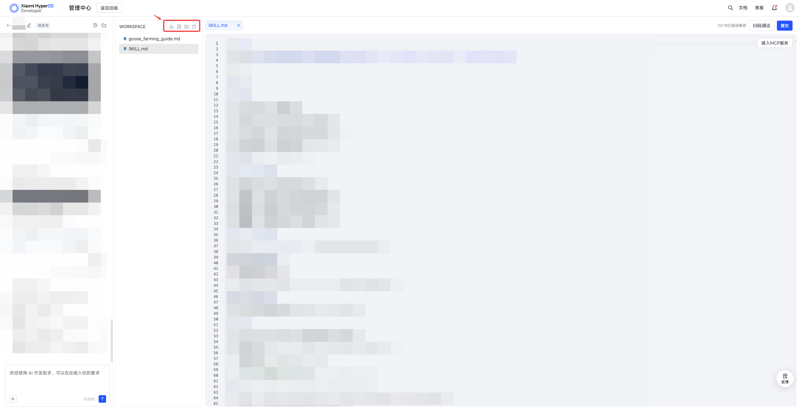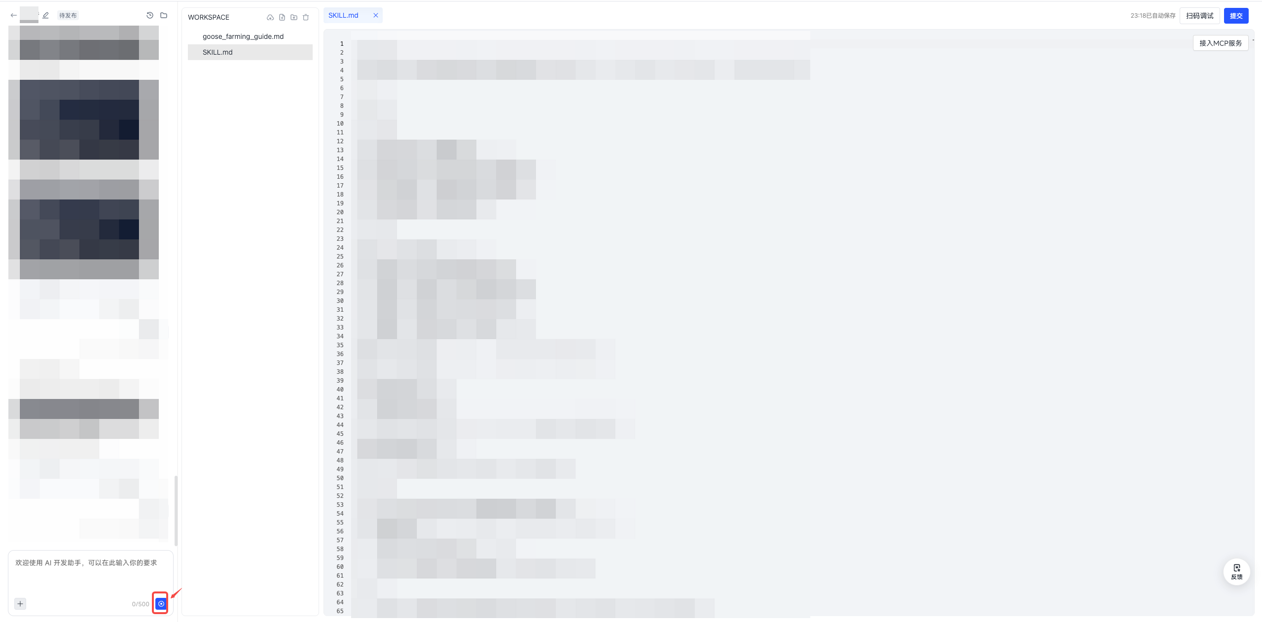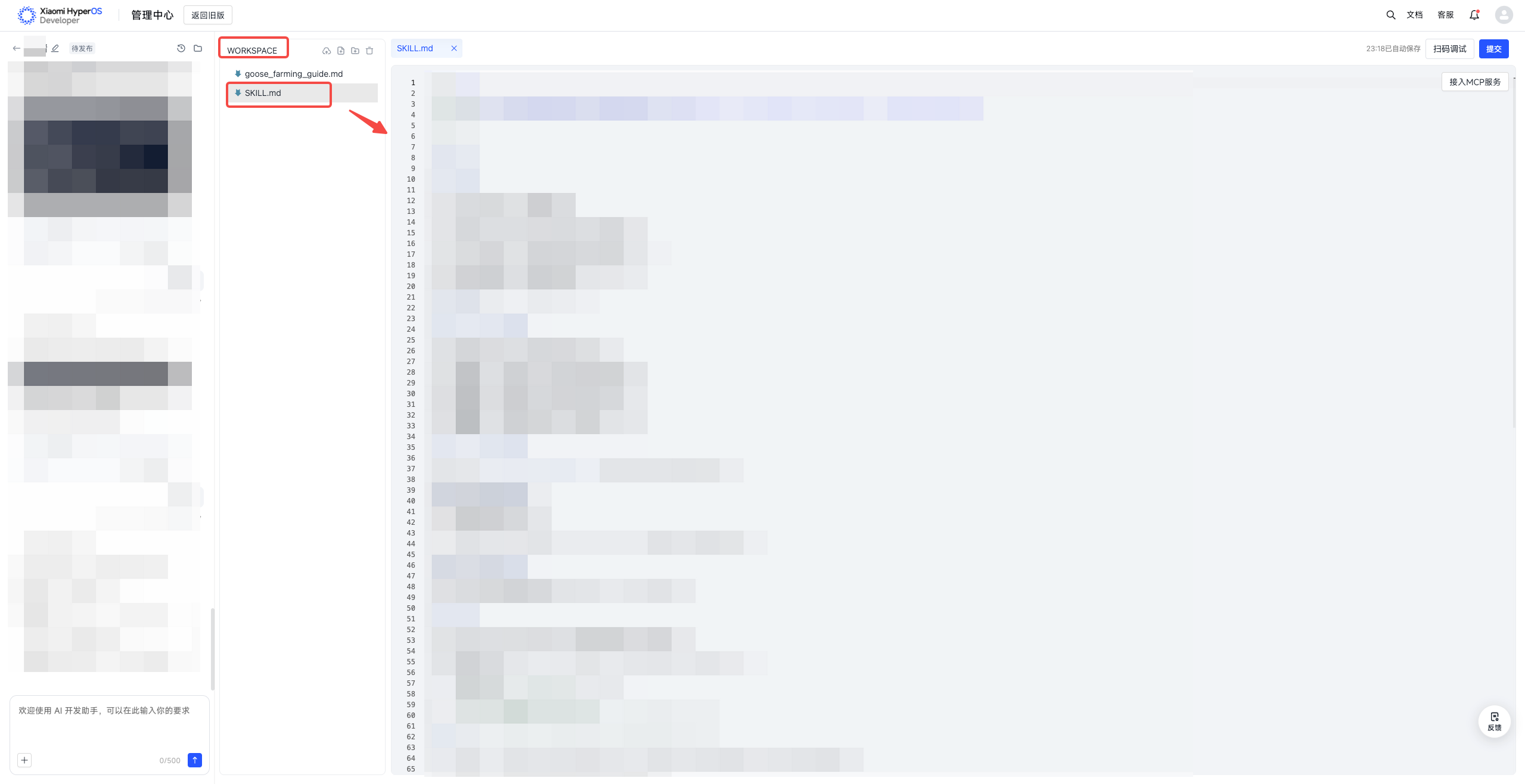 ②点击“workspace”下的目录中对应的Skill.md子菜单,允许查看/修改生成的Skill.md文件。编写过程中,草稿内容会自动保存