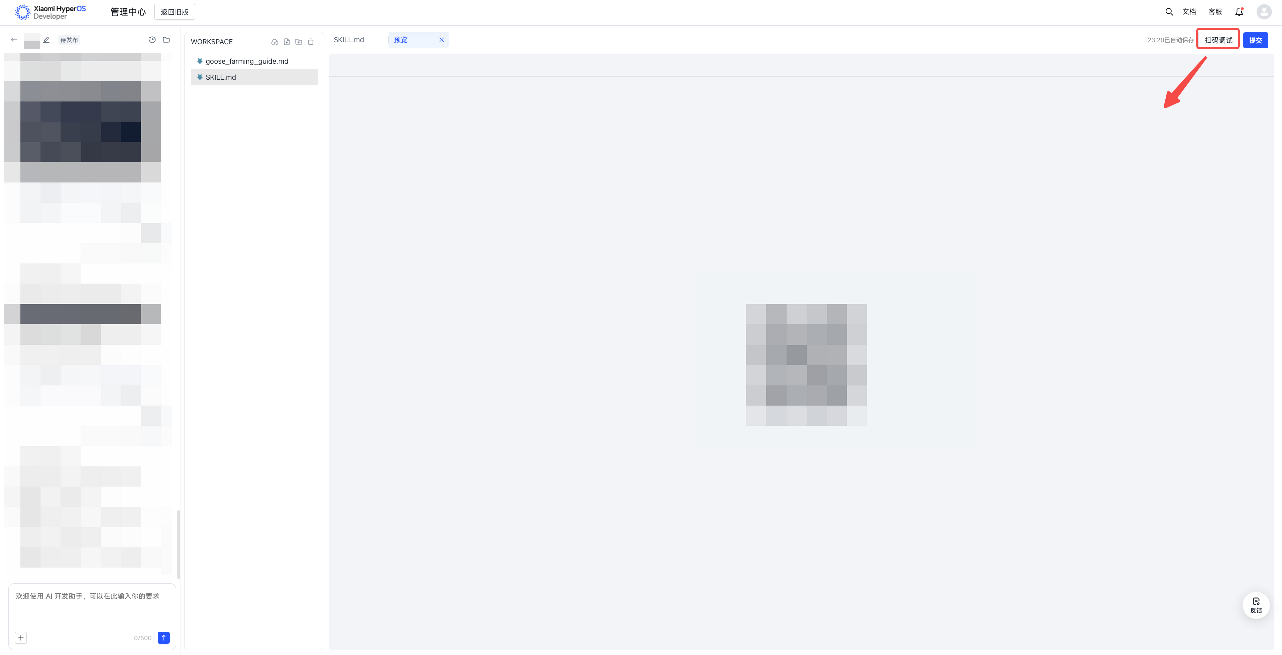 ③点击“扫码调试”,使用Miclaw扫描二维码在手机端快速调试。支持开发者打开Miclaw,进入Miclaw设置->进入Miclaw实验室->长按实验室title 5s后展示开发者选项菜单->选择开发调试->进行扫码