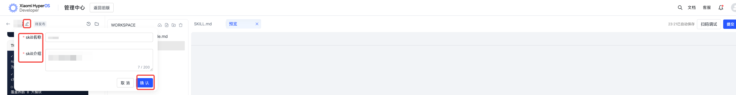 点击修改icon,支持修改Skill名称、Skill介绍。修改后点击“确认”,无需审核直接生效
