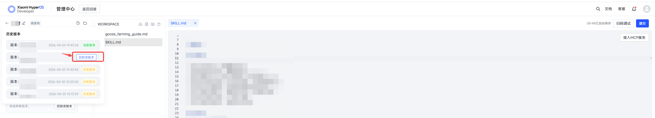 点击“回到该版本”,支持回退到对应版本生成的Skill