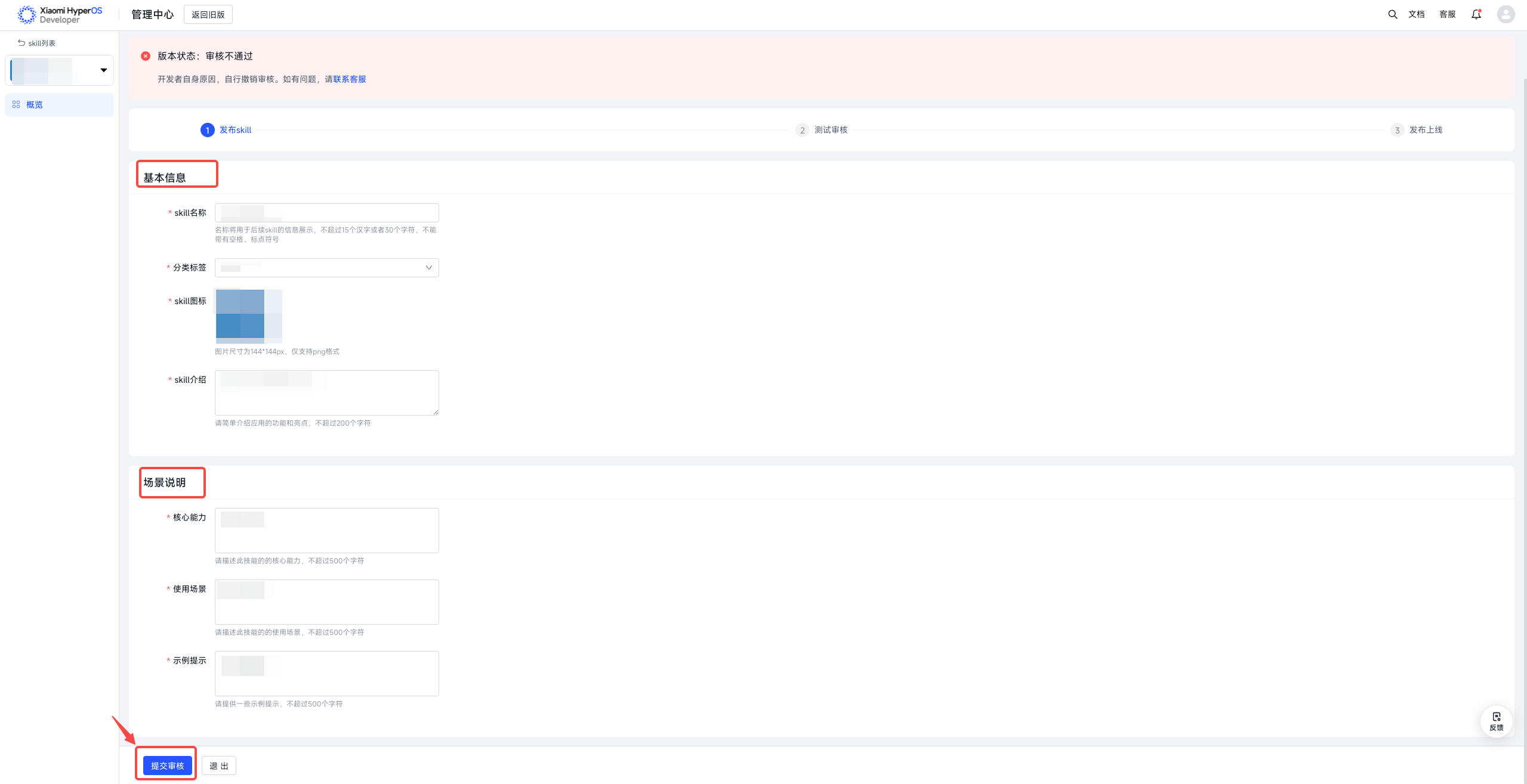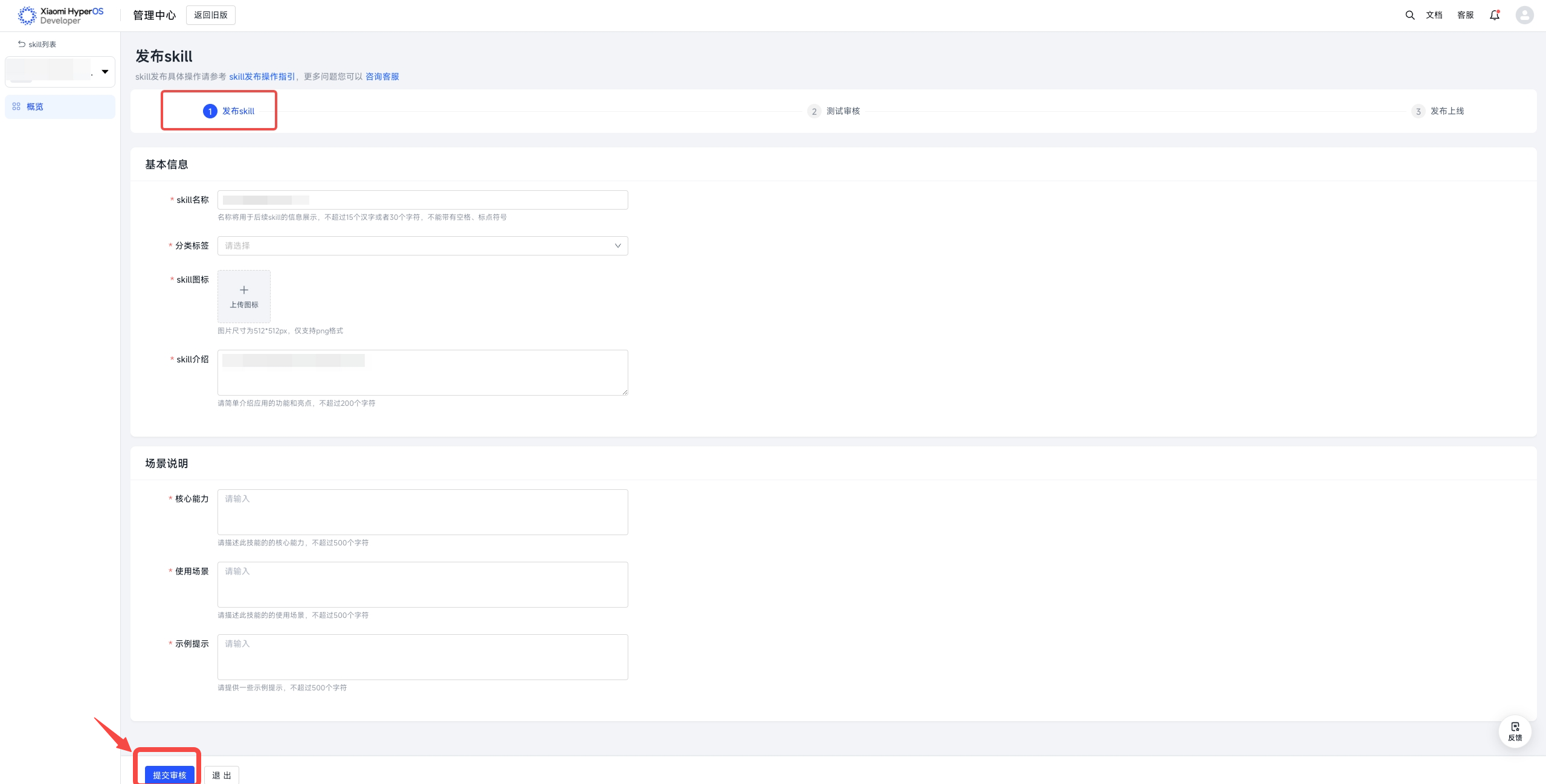 ①点击“提交”,进入发布阶段。您可以在Skill在线开发平台页面点击“提交”,提交Skill技能